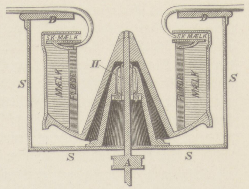 Maglekilde Centrifugen, i den Form den fik 1879. Paa en lodret Aksel A, der bæres af et „Bundspor” og støttes af „Halslejet” H, er ophængt et cylindrisk Kar, der ved sin kegleformigt optrykkede Bund er fæstet saaledes paa Akselen, at det maa følge med, naar denne drejes rundt. Indeholder Karret Mælk, vil denne, naar Akselen sættes i hurtig Omdrejning, af Centrifugalkraften slynges ud mod Karrets Væg og stille sig som en lodret Mælkering, idet Mælken hindres fra at slynges ud af Karret, derved at dette er delvis dækket af et fastsiddende, ringformigt Laag. Ved tre, lodretstaaende Staalplader, saakaldte „Medbringere”, der ere fæstede paa Karrets indvendige Cylinderflade, tvinges Mælken til at følge med rundt. Den lette Fløde vil ved Centrifugalkraften udskilles nærmest Centrum, medens den tungere Skummetmælk vil slynges yderst mod Cylindervæggen, hvor Skummetmælken foroven kan gaa bag om og op over en ringformig „Skilleplade”, der er fastloddet paa og bæres af de tre „Medbringere”, og paa hvis Underside der ses en „Fløderende”. Fra denne og fra Rummet over Skillepladen fjernes henholdsvis Fløde og Skummetmælk gennem „Spidserne” af to „Skummerør”, der ere fæstede paa en ringformig „Dækplade” D, der atter ligger fast paa den faststaaende, store, cylindriske „Skærm” S, hvor inden i selve Centrifugetromlens Omdrejning foregaar.