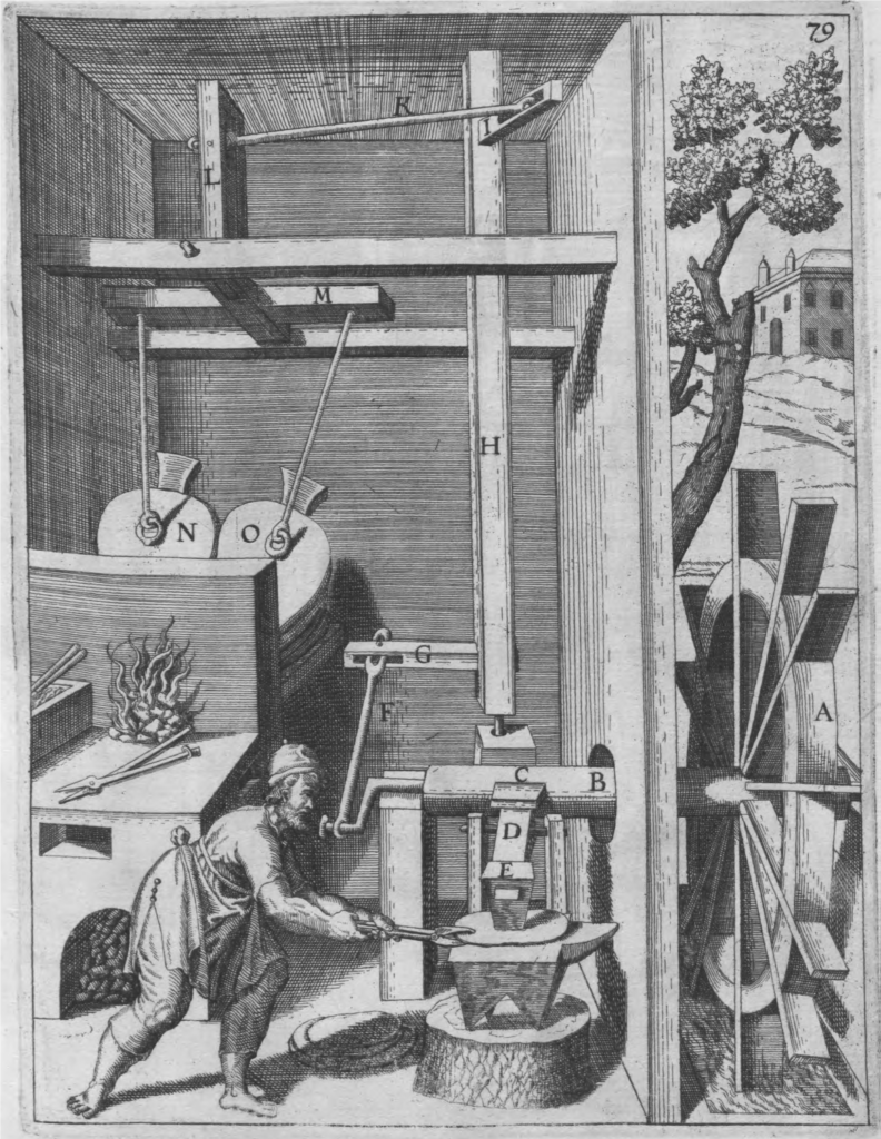 Vandhjulet A driver akslen B, der med hævearme C løfter hammeren E ved tryk på hammerens bageste del D og lader den igen falde. For at drive blæsebælge har akslen B en forkrøbbet aksel, der via stangen F bevæger stangen G frem og tilbage, og dermed bevæger H, I, K, L og M der trækker blæsebælgene N og O.
