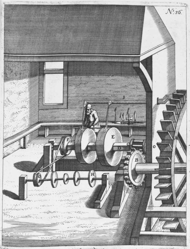 Vandhjulet A driver gennem sin aksel tandhjulet B, der er i indgreb med C, der gennem akslen D driver slibestenene E. Vandrenden I fører vand til slibestenene.